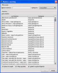Każdy użytkownik, pracując z jednym ze swoich zestawów (szerzej opisanych w Rozdziale 1), ma pewną pulę warstw możliwych do wyświetlenia. Pula ta jest dla każdego użytkownika ustalana przez administratora systemu. Użytkownik może dodawać kolejne warstwy do bieżącego zestawu, aż do wyczerpania się puli dostępnych. Po wybraniu niniejszej funkcji, zostaje wyświetlone okno wyboru warstwy, przedstawione na rysunku. Odnalezienie konkretnej warstwy możliwe jest przy użyciu wyszukiwarki znajdującej się w górnej części okna. Dodatkowo wprowadzono kategorie grupujące warstwy w zależności od ich charakteru lub źródła. Po wybraniu jednej z nich wyświetlone zostaną tylko warstwy z danej grupy. Tabelka umieszczona poniżej zawiera listę dostępnych pozycji. Możliwe jest ułożenie jej poszczególnych kolumn w porządku alfabetycznym przez klikanie w ich nagłówek.